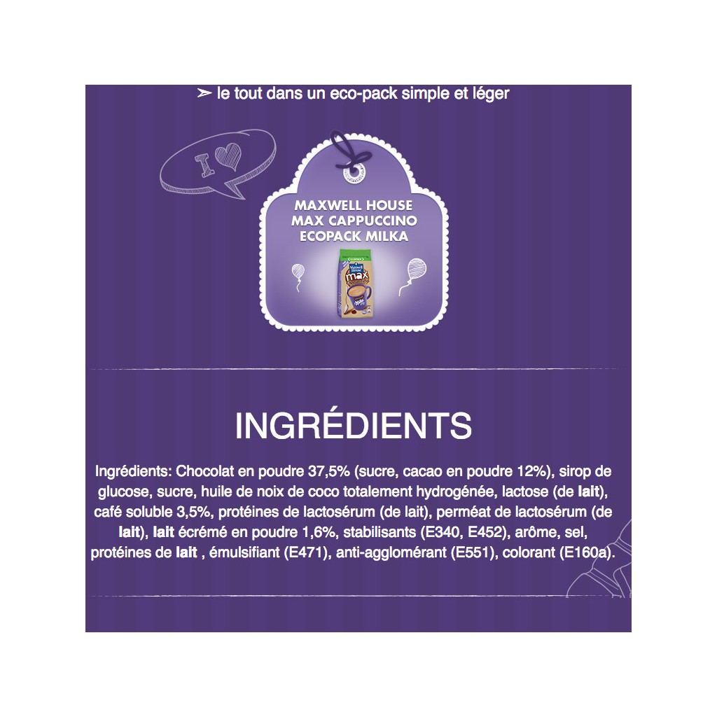 Une pure gourmandise en toute simplicité! Appréciez tout le bon goût du tendre Chocolat Milka dans votre Cappuccino avec une mousse gourmande! Lot économique de 3. Chocolat en poudre 37,5% (sucre, cacao en poudre 12%), sirop de glucose, sucre, huile de noix de coco totalement hydrogénée, lactose (de lait), café soluble 3,5%, protéines de lactoserum (de lait), perméat de lactoserum (de lait), lait écrémé en poudre 1,6%, stabilisants (E340, E452), arôme, sel, protéines de lait, émulsifiant (E471), anti-agglomérant (E551), colorant (E160a).